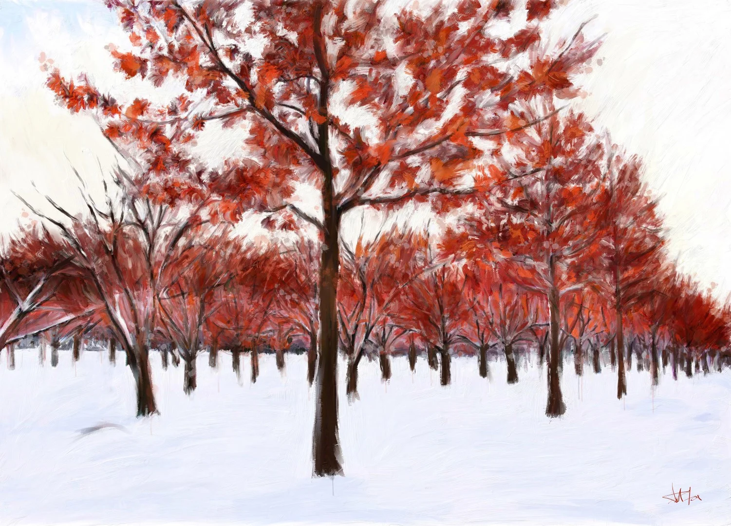 The latest edition to Winter's Form and Juncture collection. This painting from a picture taken in January 2009 in Rotterdam captures warm hues over the wintry, Kralingse Plas.